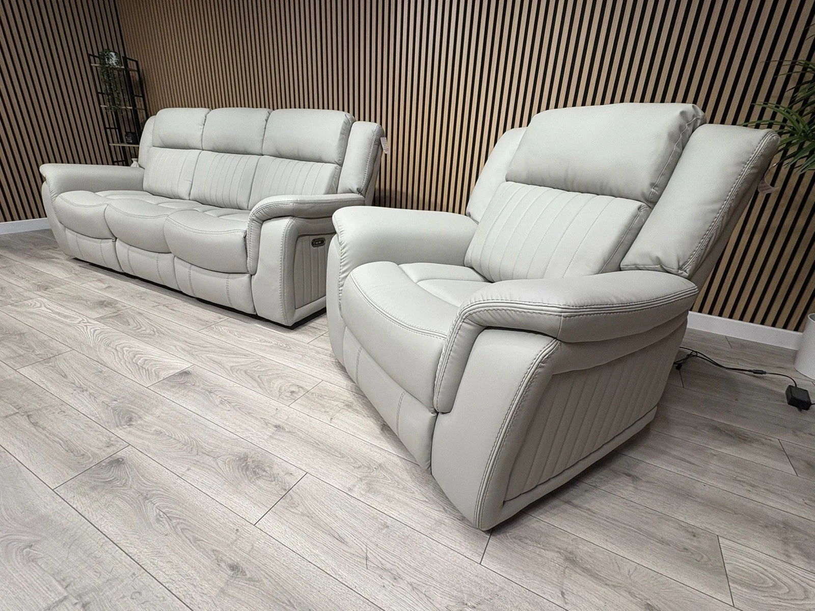 Introducing the Domino Power Reclining Sofa Set, designed for those who seek the perfect blend of luxury and functionality. Upholstered in soft, supple light grey leather with stylish stitched detailing, these sofas offer both comfort and support.