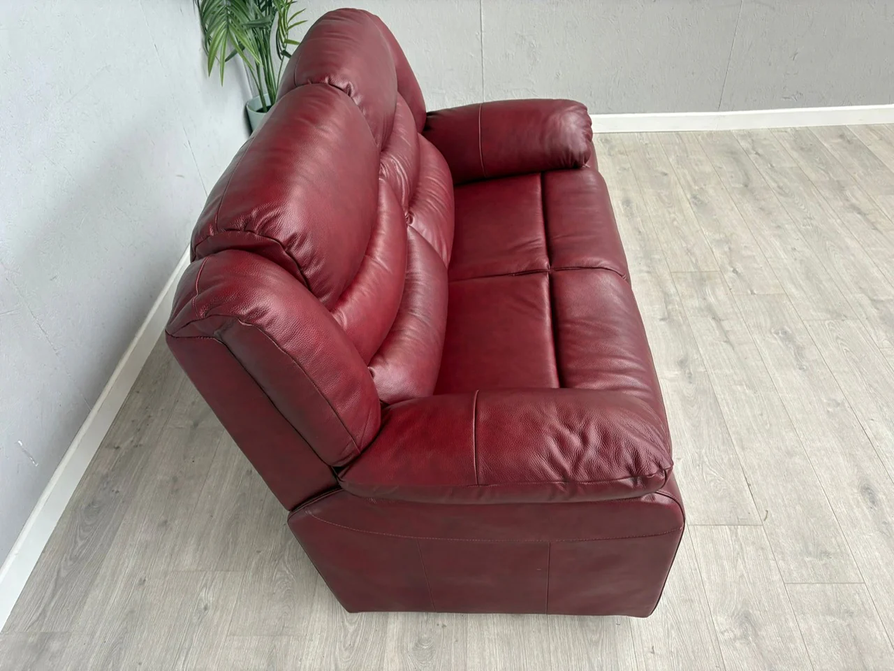 Make a bold statement with this stunning red leather two-seater sofa. Designed for those who value both style and substance, it features a commanding high back that cradles your head and neck in comfort, whilst generously padded cushions throughout ensure you sink into relaxation. The structured, boxy frame delivers clean lines and contemporary appeal, whilst wide padded armrests provide the perfect perch for an evening unwind. Built with deep foam seat cushions and premium leather upholstery, this fixed seating piece is engineered for lasting durability and timeless elegance. Transform your living space into a sanctuary of sophisticated comfort.